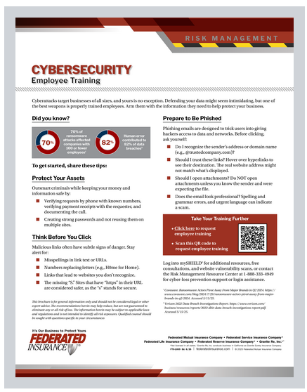82% of data breaches are caused by human error. Whether it’s clicking a suspicious link or reusing weak passwords, a simple mistake can expose your business to major risk. Federated Insurance® encourages you to train employees to become your first line of defense.